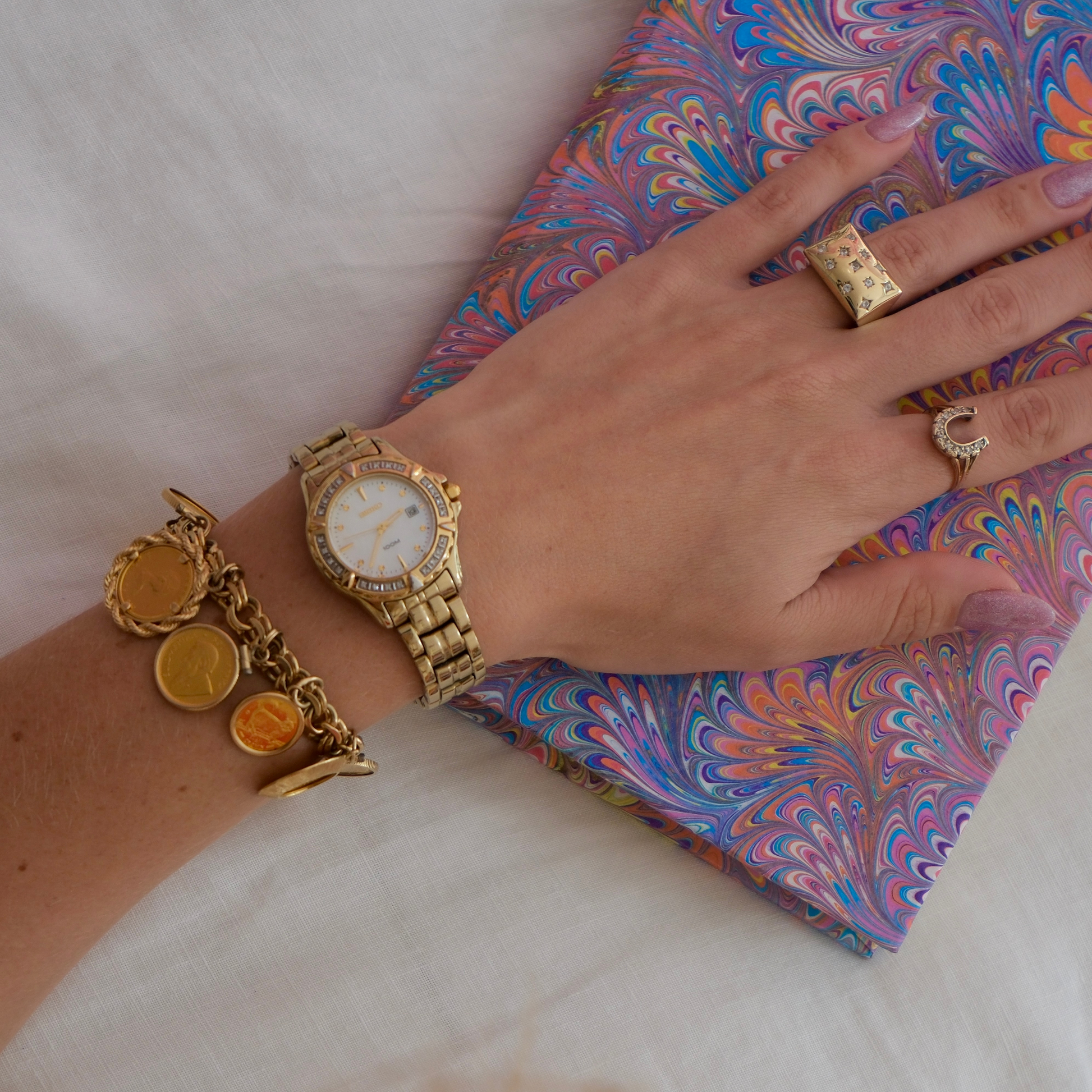 Crafted by renowned watchmaker Seiko, this elegant gold-tone timepiece features a mother-of-pearl dial framed with natural diamonds, blending timeless precision with a touch of everyday luxury.
